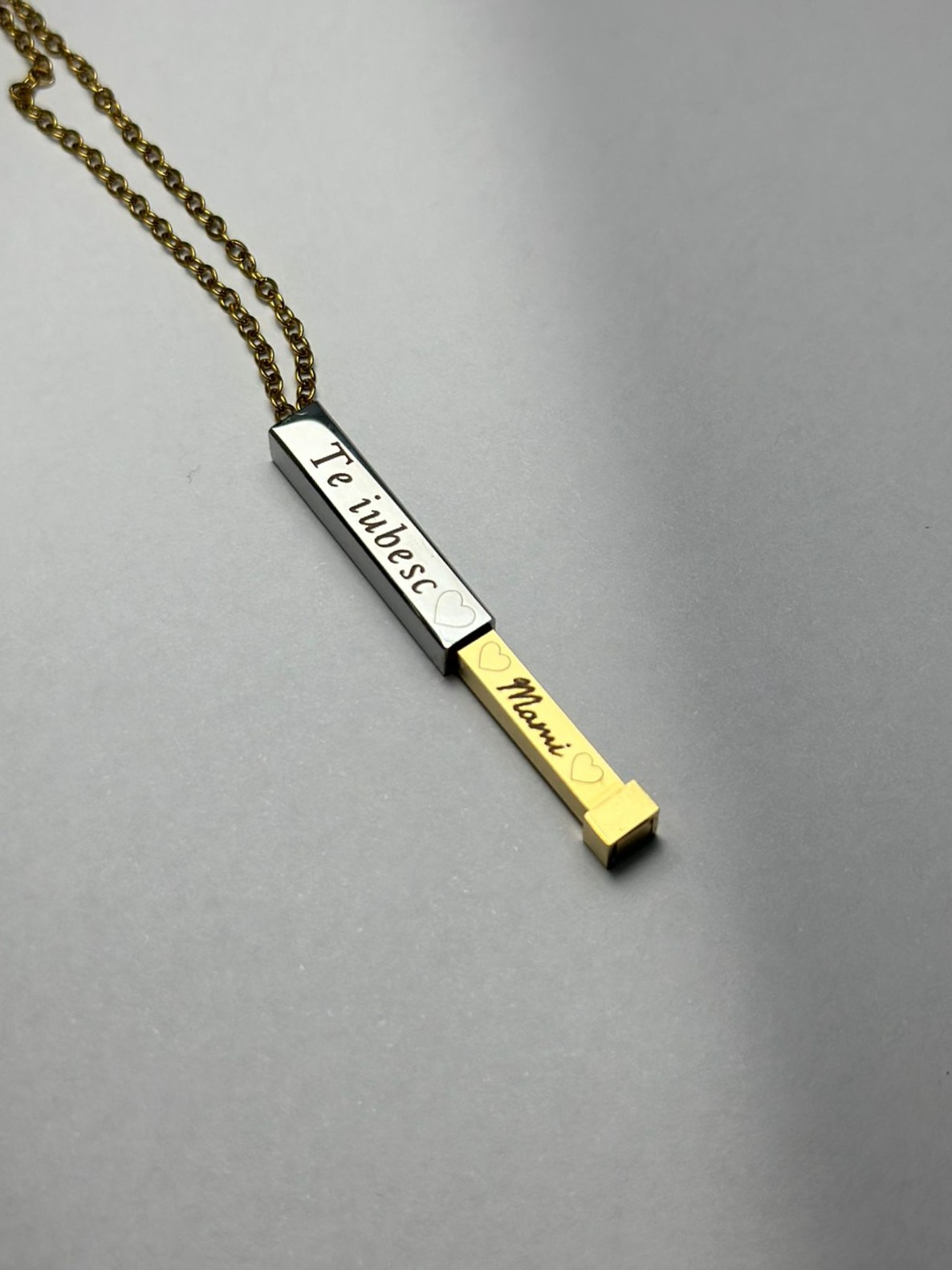 Descoperă colierele noastre premium din oțel inoxidabil, platinate cu aur și argint, create pentru cei care își doresc un accesoriu modern, rezistent și 100% personalizabil. Designul glisant al pandantivului permite gravarea pe exterior și pe interior, transformând colierul într-o bijuterie unică, cu mesaj ascuns sau vizibil.