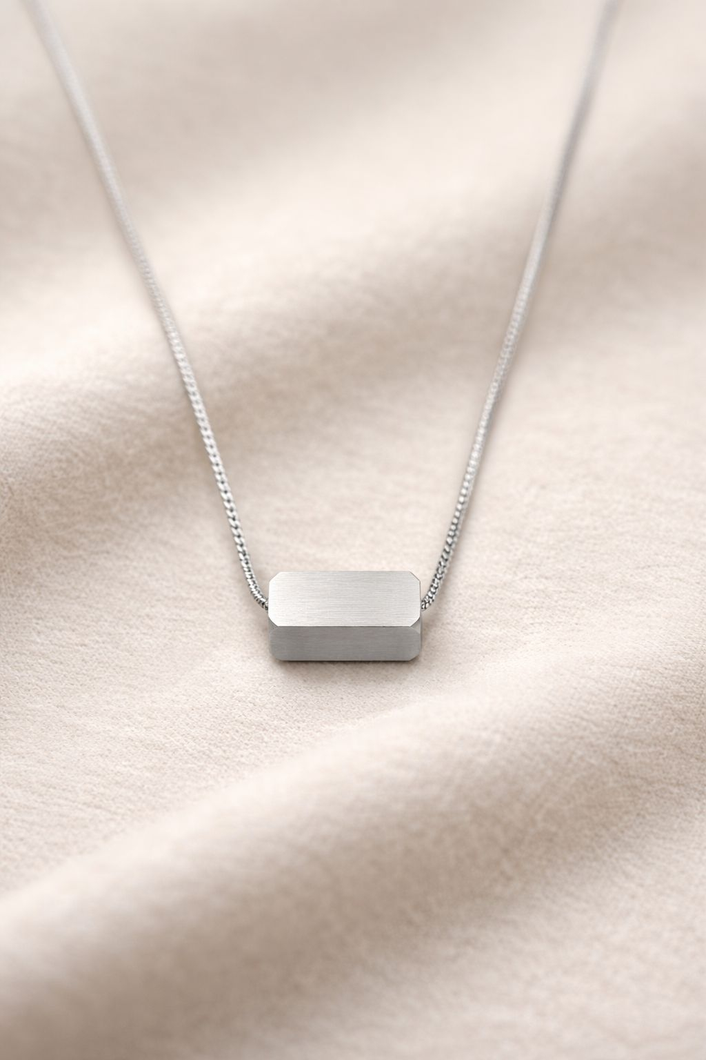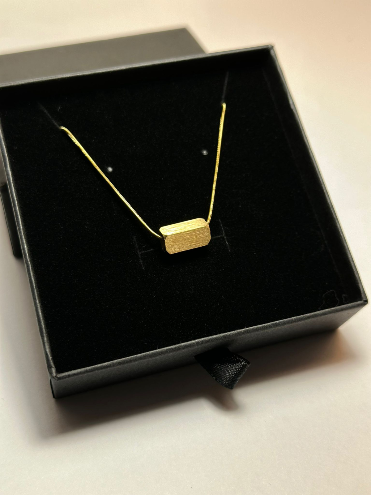 Acest colier rafinat se remarcă printr-un design minimalist, având un pandantiv geometric din oțel inoxidabil de înaltă calitate, placat cu aur 18K pentru un aspect luxos și modern. Finisajul periat al pandantivului îi conferă o textură elegantă și un stil aparte, perfect pentru ținutele de zi cu zi sau pentru ocazii speciale.