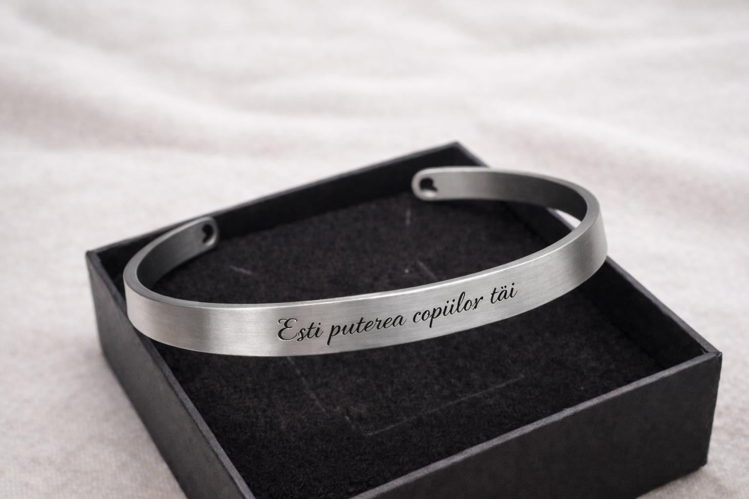 Fiecare piesă poate fi personalizată prin gravură: mesaj, nume, simbol sau chiar o imagine cu semnificație specială, transformând setul într-un accesoriu cu adevărat unic.